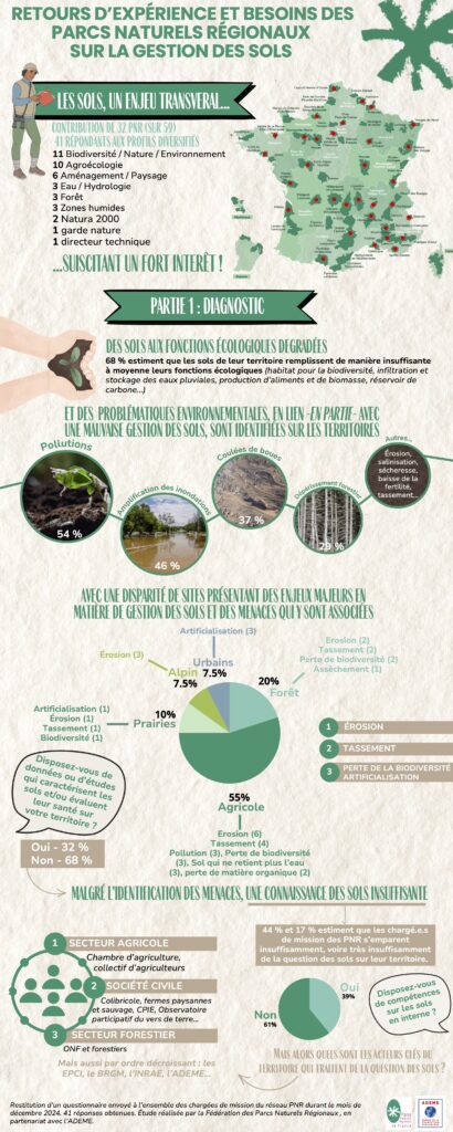 L’agriculteur ou le chargé de mission de parc régional. Les 69 PNR sont des nouveaux venus dans le monde des sols. Leur objet premier est de valoriser tous les patrimoines d’un territoire, en en faisant causer leurs usagers et acteurs. Les PNR sont des parlements qui ne disent pas leur nom. « Les agents ont des liens très forts avec les habitants, les acteurs des territoires, dont les agriculteurs. Ils peuvent sensibiliser sur les sols, » présente Léa Pourchier, chargée de mission Énergie, Biodiversité et Sols à la fédération nationale des parcs naturels régionaux. « Un autre élément important et intéressant, c’est que les PNR sont aussi des outils d’expérimentation. On aime bien tester ! Beaucoup d’acteurs viennent nous voir pour mettre en place de nouvelles choses. Il faut juste que cela corresponde avec le projet de Parc, » inscrit dans sa charte, qui est sa feuille de route stratégique discutée et approuvée par les élus des communes adhérentes. Elle dure quinze ans et est rediscutée à l’issue de cette période. Les sols font désormais partie des patrimoines à préserver. La fédération nationale des parcs naturels régionaux y est arrivée par… les éoliennes. « On est soutenus financièrement par l’ADEME, sur une convention de sensibilisation des agents des parcs sur l’impact des énergies renouvelables sur les sols. On a mené quelques actions, des webinaires, des partages d’informations et à la suite d’une enquête que j’ai menée auprès des agents, je me suis rendu compte qu’il ne fallait pas seulement se limiter au secteur de l’énergie, car en fait, il y avait des besoins énormes de partout, et même des demandes de la part des agents de créer vraiment un groupe de travail sur les sols. » Car les agents constataient depuis quelques années une dégradation des sols, de leurs fonctions écologiques, sans se sentir capables d’y remédier, faute de suffisamment de compétences. Convaincre les élus de l’importance des sols lorsqu’ils ont à réfléchir à un projet d’énergie renouvelable, lors des discussions relatives au renouvellement (ou pas) d’une charte. Former les agents à prélever des sols, à réaliser des diagnostics, à épauler les agriculteurs. « Mieux connaître leurs sols, cela ressort beaucoup dans la bouche des élus, pendant le processus de révision, » se réjouit Léa Pourchier. Dans ce but, 5 PNR – en cours de sélection – vont devenir dès cette année les pilotes d’un plan d’action en faveur de la santé des sols, à partir de ce que le PNR des caps et marais d’Opale est en train de faire depuis janvier 2025 : une vaste vulgarisation à destination des gens, des élus et des techniciens du parc, à base de résidence d’artistes, de conférences sur les liens entre sols et alimentation et de parcelles tests.