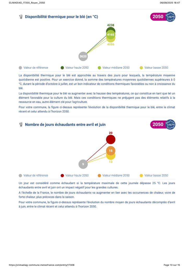 Le blé serait néanmoins très favorisé par la hausse de la température moyenne. Sa « disponibilité thermique » (nombre de jours où la température moyenne est positive) augmentera, elle passerait de 3 620 (en °C) à 3890-4087 en 2030, elle pourrait atteindre 4 238 en 2050 et 4 627 en 2100. Une félicité qui corrigerait la baisse des rendements enregistrée depuis vingt ans et relancerait nos exportations. À la condition qu’il y ait assez d’eau disponible dans le sol… et que les températures n’augmentent pas trop ! Car au-delà de 25 °C, les cultures commencent à souffrir de la chaleur. Au fil des jours, cela amène à l’échaudage, les rendements baissent, la qualité des produits se détériore et en définitive, les cultures meurent sur pied : j’ai un souvenir très fort des tournesols penchés par terre lors de la canicule de 1976… Le nombre de jours dits « échaudant » est d’environ 9 du côté de Royan. Il passerait à 17 en 2030, de 13 à 20 en 2050 et de 18 à 25 en 2100. Presque un mois de risque d’échaudage, cela commence à faire beaucoup.