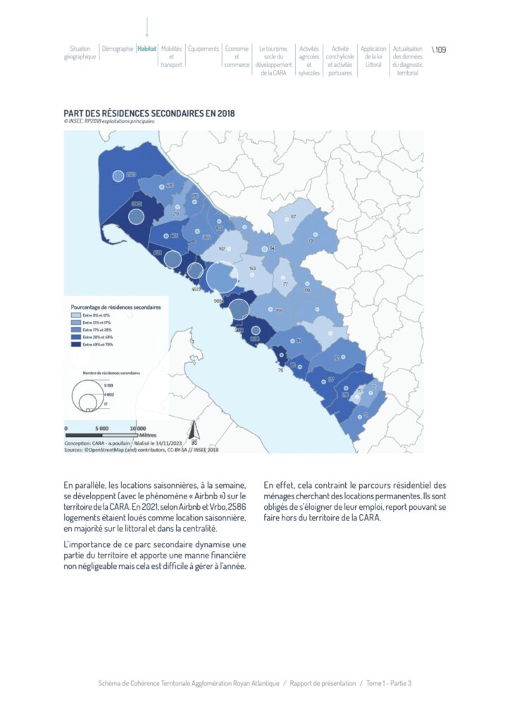 Sur le territoire de la CARA il y a a priori autant de logements que d’habitants. Mais 43 % sont des résidences secondaires, un taux qui grimpe encore sur le littoral. L’offre s’en ressent et les résidents permanents, jeunes ou moins jeunes, sont obligés de gagner l’intérieur des terres. Là où ils vivent, les locaux sont pour près des trois quarts propriétaires-occupants, de maisons individuelles de grande surface pour les deux tiers d’entre eux, dont la moitié a été construite avant 1975 (ce n’est pas le cas à Royan). Non seulement le logement est cher, en plus il est a priori énergivore (l’habitat consomme la moitié de l’énergie utilisée sur le territoire, et est le second émetteur de gaz à effet de serre).